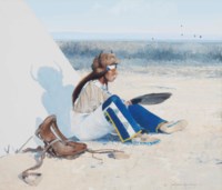 1946 Sitting in the Sun signed and dated Michael Coleman--1977 with artists device lower right gouache on board 12½ x 14½ in. Worlds 1 art site. Art of the american west.